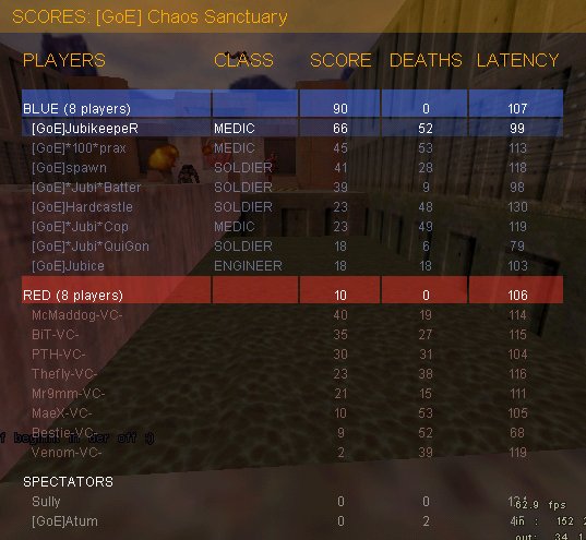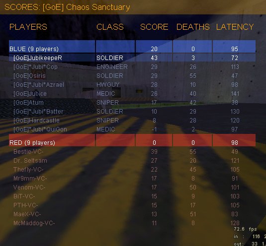In 2fort war ich dann mal off-position und habe mich in die Riege der Offler eingereiht. So stürmten wir alle los und sahen uns gleich beim Rush auf der Bridge schon 2 Soldiers gegenüber gestellt. Da merkt man gleich, dass VC in einer anderen Zeit gespielt hat: Es durfte geballert werden nach herzenslust, ohne dass sich jemand beschwert hat. Erfrischend. :) Als wir dann im Basement waren merkte man gleich: Einmal DG immer DG, die Jungs standen doch sehr sicher. Es wurde gefightet, gespammed und ge-tked, aber wir schafften es doch, ein paar Flaggen rauszuholen :) Aber auch VC war nicht untätig und TheFly entführte uns nach hartem Kampf eines von unseren kostbaren Seidentüchern.