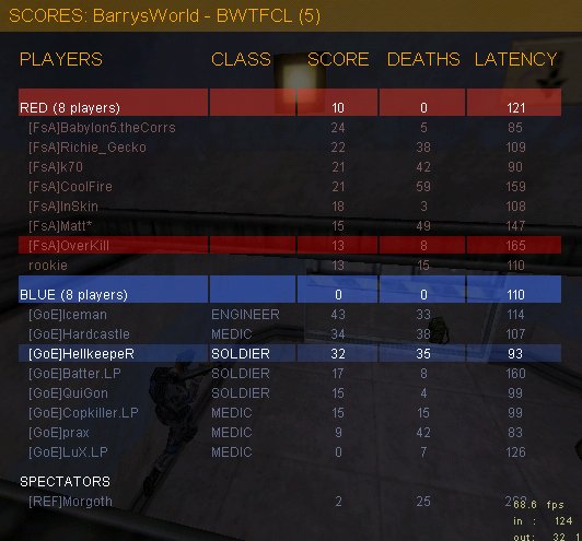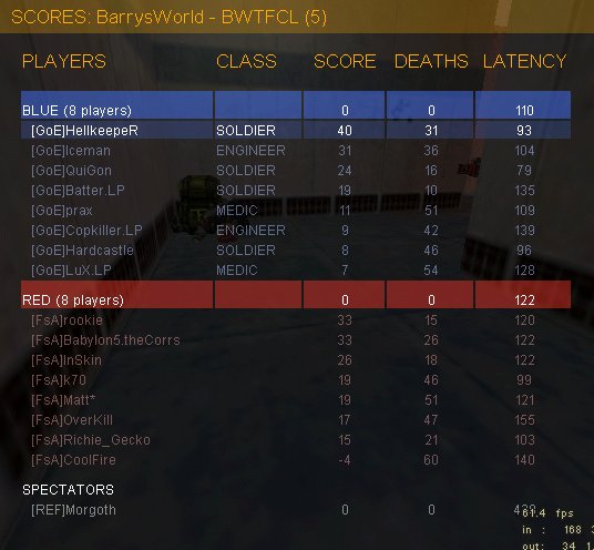 Wir fingen an, standen sicher und die Off machte gut Druck. Auf einmal Touch, Flag wird lange getragen, dann auf dem Sniperdeck gestoppt, wo sie Returned. Dann passierte der SuperGau. Bei uns droppte ich, eigentlich nicht so wild. Gleichzeitig höre ich im BC, dass wir Flagge touchen, na umso besser. Nur leider hat es mit mir auch 6 FsA-Spieler vom Server gehauen, um genau zu sein alle die, die mit Telekom online waren. Der Ref pausiert den Server. Wir stimmen einem Restart zu, als alle wieder da sind. Die Def steht von FsA jetzt sicherer, die Off hat aber weiter ihre Probleme, bis ja bis auf einmal einer von denen an der Flag war und nicht mehr zurückschaute.