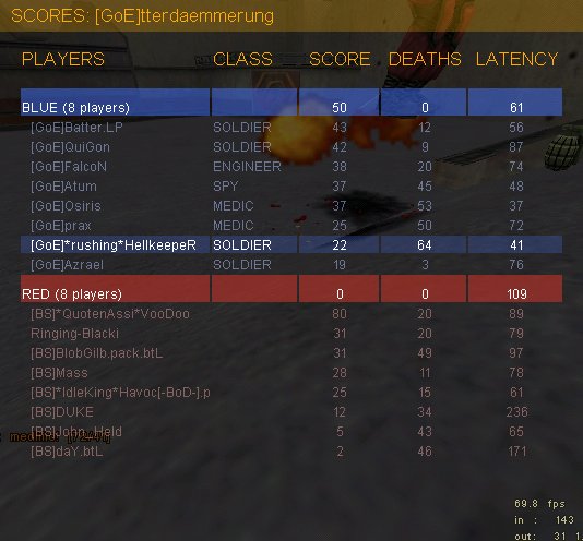 Auf monkey_l ging es dann heiss her. BS stellte einen dicken fetten HW ans Ende der Brücke und einen in den Flagroom. Also machte ich mal wieder den Sniper und versuchte, den Brücken HW zu beseitigen und hin und wieder auch mal Spy oder Medic, während auch hier die anderen 3 Offler die Flaggen holten. Meine 2 Caps allerdings habe ich mit nem Sniper gemacht, soviel zu dessen Clantauglichkeit ;)