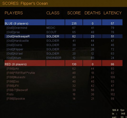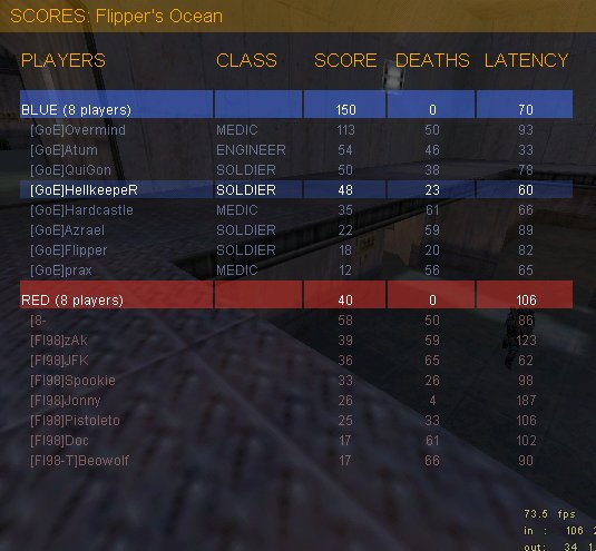 Ich formuliere es mal so: wenn nur 25% der Standardformation da sind und einer Engi spielt, der das in seinem Leben bisher 4-5 mal gemacht hat, lässt es sich nicht gut verteidigen. Dadurch hat FI98 das geschafft, was bisher nur VC gegen uns vergönnt war: Mehr als 100 Punkte in einer CTF-Map gegen uns zu schaffen.