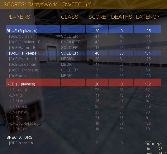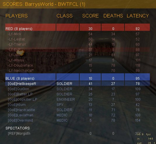 Up comes ofire. Same game: After a rush-touch by -lf- silence came to both sides of the map. =) Well, -lf- got our flag to the switch where it was dead meat for 55s, then, in a great act of stupidity, I managed to shoot a medic on the flag and a second one right after that, 1:0 -lf-, we decided to open up our def a little bit and go all or nothing and, as you can see, it ended in nothing. :(