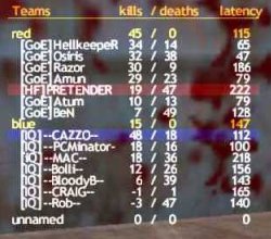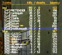 Unser erstes Match der 2. DTFCL oder 1. DeCL-TFC Saison (ganz wie man mag) mußten wir gleich gegen einen der Favoriten in unserer Gruppe, simply IQ, ran. Leider war aufgrund der Weihnachtsferien bei uns ein wenig Memba-Mangel, den wir aber durch HF|Harlequin und HF|Pretender ausglichen, many thx. Diese beiden machten auch die Haupt-Caparbeit in Well, wobei Winnetou, Atum, Razor und ich die Defense kontrollierten, IQ war hier nur ein Anfangs-Cap möglich, Ergebnis 90:10. In der zweiten Halbzeit verließ uns aufgrund verringerter Spieleranzahl dann Harlequin und in rock2 konnten wir ausgeglichen (von den Spielern her) cappen. Auch hier gelang IQ wieder nur ein Cap, allerdings geschah dies fast unbemerkt, da ihre Offense uns Def-Leuts sehr wirkungsvoll ablenkte, Ergebnis 45:15, Gesamtergebnis 135:25.