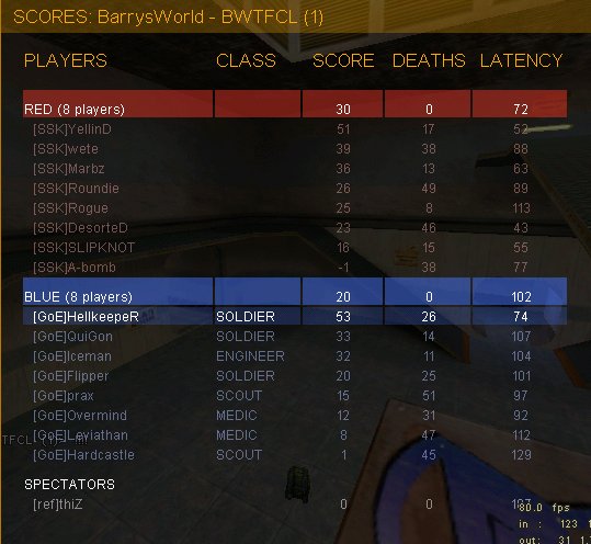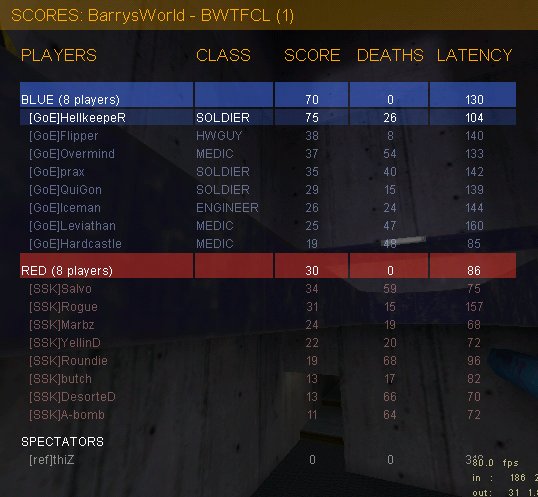In well we started out with 5 Def, where SSK played 4 immediately. They managed to get the first touch AND cap and still put constant pressure on us. After we had to touches wich both returned, I sent the 5th deffy in O and we finally tied it up. We could touch again pretty soon and when we capped it, our flag was on the move again. I pulled back the 5th Deffy so we took a little pressure off if the SSK-off whereas our 3 front guys were able to maintain their flow. So the map ended 70:30 us. Btw. I had to cap it once since our offys got afraid of our FR-entrance some time into the game, so still no 70 game in will... :)