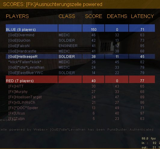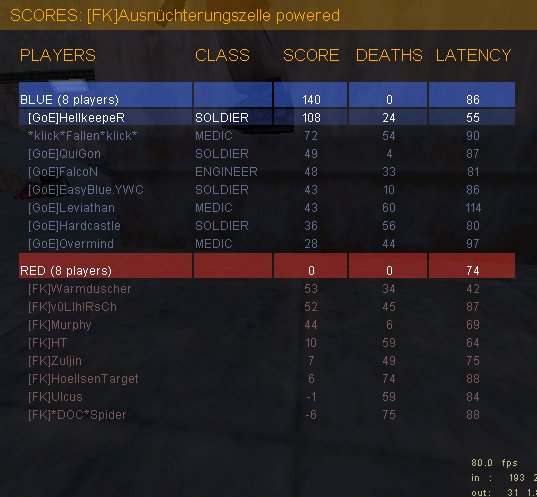 Da wir kurz vor dem Spiel beim Taktik-machen auf insurrection festgestellt haben, dass diese einen nicht unerheblichen Bug enthält (das rote Team kann Sentryguns im Flagroom nur zwischen Lift-resupp und Resupp-bag im T-Gang bauen, wohingegen das blaue Team diese Einschränkung nicht hat), wollten wir auf Grund der daraus folgenden Ligauntauglichkeit lieber stowaway_l spielen, was FK jedoch nicht gefiel; und so spielten wir dennoch insurrection (wir natürlich blau :p), wobei der Bug jedoch nicht ausgenutzt wurde.