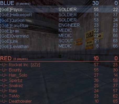 Leider hat im letzten drittel der Map der Server angefangen rumzuspacken (zumindest für mich als ISDN-Zocker), sodass ich ab da eigentlich eher als Opfer fungiert habe - aber trotzdem konnte ich noch die letzte Flag 5 Sekunden vor Mapende cappen. =)