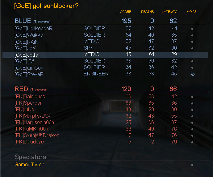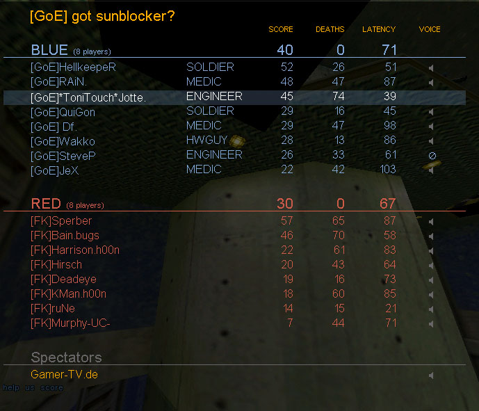 Es sollte ein großer Abend werden, Topspiel der Gruppe 1 der ESpL Premiership, auf TF-Scene.de gabs einen Vorbericht und wenn man den Äußerungen der FKler im Vorfeld in hitzigen Diskussionen im Forum und auf Partys im ruhigen Nettetal Glauben schenken dürfte, müssen wir gegen den besten OffSoli in .de bestehen und rennen gegen die im Vergleich _eindeutig_ überlegene Defense an. Wir dagegen haben eh nur Nieten in der Def, die entweder nur rumlucken oder nur Lastline spielen können :p. Aber unsere Off ist wohl doch etwas stärker (trotz Fehlen des Offsolis, ist ja beruhigend :p).