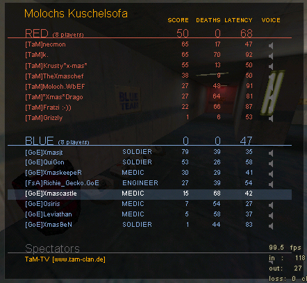 Vom Duft von Glühwein und Lebkuchen in der Pyramide aus dem Schlaf gelockt war uns klar, dass das alljährliche Weihnachtsmatch mit TaM ansteht. Da steam ein böser Gollum ist und das alte TFC ein lieber Smeagol war klar, dass die gute alte 1110 version herhalten musste. Die schnell hatte jeder die half-life cd entstaubt und das progrämmchen auf dem richtigen stand - und dann konnte es ja schon losgehen.