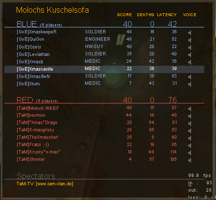 Dann wurde jedoch zur zweiten map baes_r2 angepfiffen - eine GoEtter spezialmap, die jeder aus dem Effeff beherrscht und verinnerlicht hat. Als es Ben dann auch beherrscht hat, sich die map runterzuladen konnte er wieder das team joinen und sich die map 30 minuten mit grossen Augen mal anschauen. Geschickt benutzten wir die Verwirrungstaktik offense und defense zu tauschen - bis auf Richie, da sonst keiner wusste wie man den Schraubenschlüssel benutzt. Da uns die TaMler verdutzt zuschauten wie unkoordiniert man im TFC herumlaufen kann, schafften wir es diesmal die Mehrzahl der Flaggen zu unserer Base zu befördern. (O-Ton: Verdammt, wir haben über 2 Jahre dieses doofe Spiel mit den falschen Leuten in der offense / defense gespielt). Ein anderes Novum: Levi beendete die map mit positiven stats in der defense !