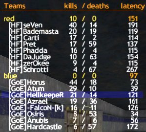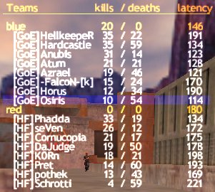 Es fing damit an, dass bei einem HF-Spieler das TFC nicht mehr funktionierte, also warteten wir einen Moment. Als dann alles klar war, hiess es von der Gegenseite, dass unser Server zu laggy sei (was m.E. nur an Surf1 liegt, da ich persönlich mit Arcor wunderbare Pings habe und das ist auch Kommerz), aber gut, nach etwas hin und her erklärten wir uns bereit, auf Volksfest zu wechseln, mit dem Erfolg, dass nun unser komplettes Team massig PL hatte und auch HFs Pings nicht gerade rosig aussahen.