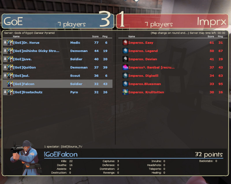 Dann war Imperox mit dem Angriff dran. Diese arbeiteten recht konsequent am Bombenwagen und hingen wie eine Mutter am Kinderwagen. ;) Darum ging dann auch alles recht ratzifatzi, schwupps war der erste und zweite Teil geschafft. Unsere 2x Engi Taktik brachte nicht so viel Erfolg gegen einen starkes Übermedic-Demoman Duo welches in einem Run beide SGs zerlegte. Somit bekam Imperox auch ein schickes Feuerwerk am Ende der Map und die Knochen in unseren Pyramiden klapperten gewaltig bei dem Endstand von 1:7 gegen uns.