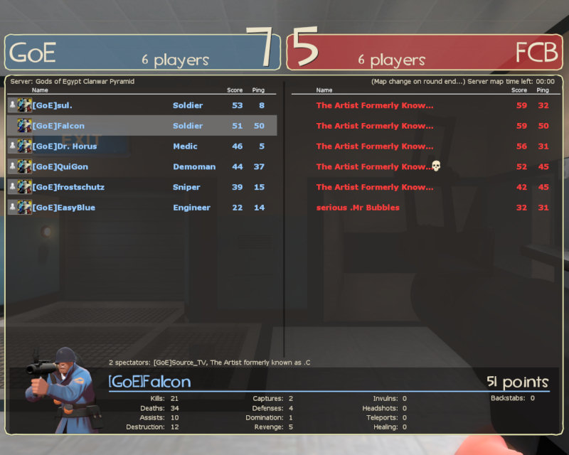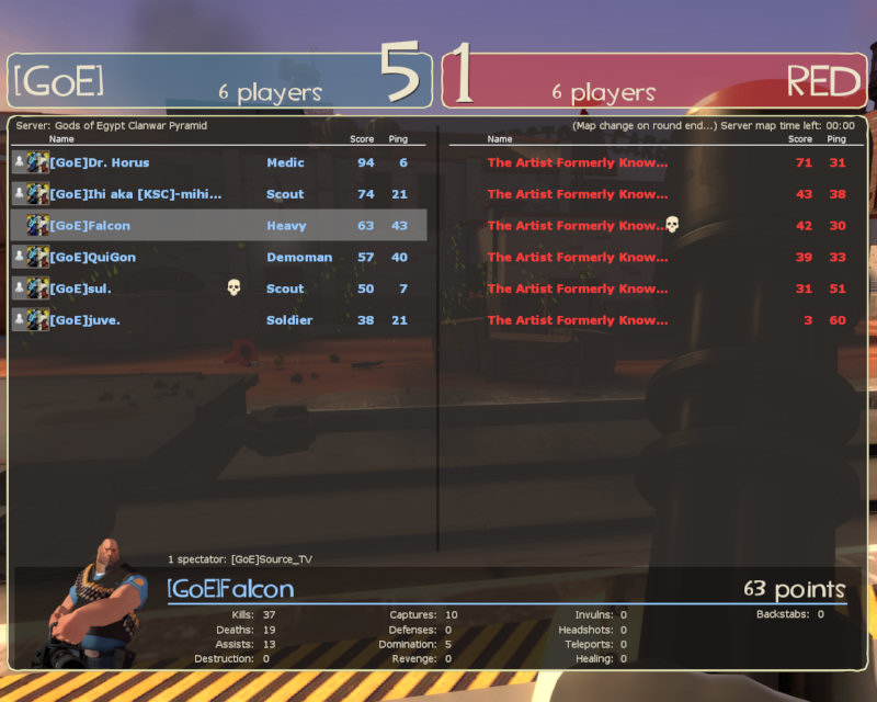 Dann spielten wir mal wieder cp_freight. Eine Map an der wir mehr und mehr Gefallen finden und auf der wir uns zunehmend verbessern. Wichtig ist hier die Mitte direkt bei ersten Angriff einzunehmen, dann hat man eigentlich die Karte in der Hand und gewinnt die Runde. Nur einmal gelang uns das nicht so recht und es kam zu einem überraschenden Gegencap. Endstand daher dann 5:1.