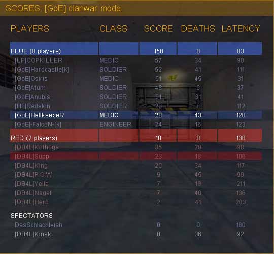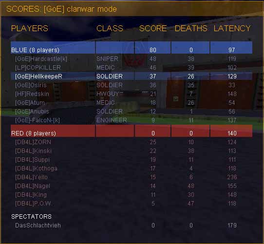 well: durch ein 9 Mann starkes team konnte der db4l spectator auch eingesetzt werden (korrigiert mich wenn ich hier falsch liege). Auch auf dieser map agierten unsere Widersacher mit haupsächlichen schweren klassen in der defense und einigen spys in der offense. Es konnten zum anderen sniper, sentries auf dem gegnerischen Dach beobachtet werden, was den spassigen Charakter des Spiels verdeutlicht.