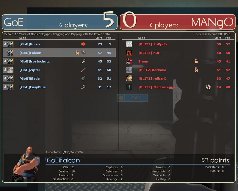 Ein gutes und siegreiches Ligaspiel. Den Anfang machten wir auf Freight, wo es zu einem klaren Ergebnis von 5:0 vor Ablauf der Zeit kam. Den Liga-Regeln nach war da Schluss. Nunja, wir hatten dann auch genug. Die BLITZER hatten einen übermässig guten und sehr verdächtigen Sniper, der ohne unterlass Headshots machte und die Punkte-Rangliste von BLITZ am Ende anführte. Ein Schelm, wer Böses dabei denken mag.