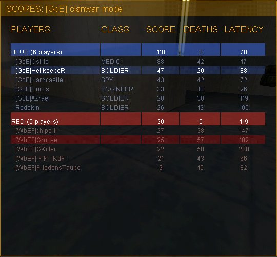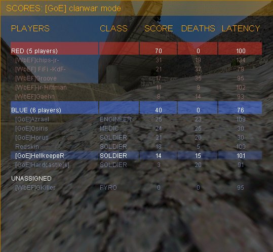 2fort: Hier droppte einer unserer Ringer prax, (danke mal fürs Ringen an ihn und Redskin - heut vergess ich das nicht wieder ;)) was sich aber nicht auswirkte da immer noch 6 - 6 Player auf dem GoE-server waren. In dieser map konnten wir WBeF stärker unter Druck setzen, so dass zeitweise auch mal einer auf sniper wechselte um seinem Fragtrieb nachzukommen. Unsere 3 Mann defense hielt den Umständen entsprechend dicht (Horus war bei beiden Halbzeiten nicht im bc afaik).