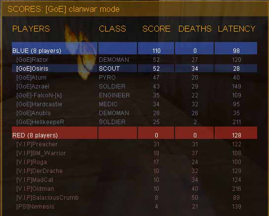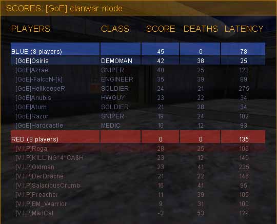 mal wieder erwies sich diese map als spammermap und auch hier versuchten die vip sich, mit einer fulldef taktik aus der situation zu retten. azrael hatte erst mal hunger und ging von einer kleinen pause aus, also spielten wir die ersten minuten ohne ihn, bis er merkte, dass es ja weitergeht :) ich hoffe es hat dir geschmeckt ^-^ . tjo, unsere off bestand auch hier aus einer bunten mischung aller klassen, da wir immerhin ganze 8 leute in die off nahmen. nur falcon als engi blieb hin und wieder hinten und schaute nach seiner sentry. gegen schluss überlegten wir, ob wir vielleicht auch mal 5 minuten fulldef probieren sollten. das brachte etwas verwirrung in unser spiel, da einige dafür waren und andere dagegen. so schaffte es der gegner unseren key (während wir auf unserem yard am diskutieren waren) bis an den yard eingang zu schleppen. dort vergammelte er dann am boden, bis er sich endlich entschied, wieder in sein warmes heim zurückzukehren.
