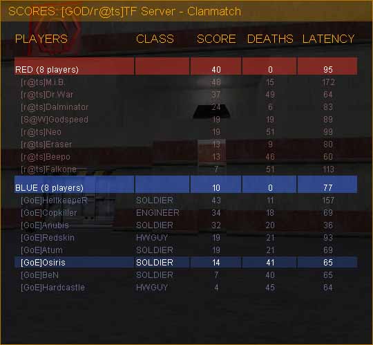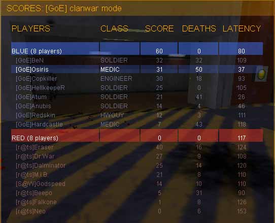 Der Anfang sollte ja noch gut laufen. Ich ging als Spy in den nmy Flagroom, killte die sg mit Grens, liess den Soli links liegen und schnappte mir die Flagge. Naja, der nmy Soli wollte das wohl nicht so recht hinnehmen und killte mich noch, bevor ich über das Brett entfliehen konnte. Aber letztendlich wurde es ein Cap, de, ein fast zeitgleicher Gegencap folgte.