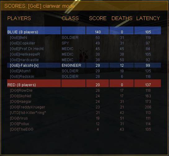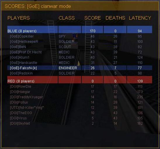 In 2fort starteten wir mit einer 4er-Def, die sich aber schnell in eine 3er-Def umstellen lies, wodurch wir mehr Druck vorne machen konnten. Langsam aber sicher malmten wir uns mal für mal durch die Defense von DGI, um die Flagge 14 mal zu entführen. DGI schaffte es im Gegenzug 2mal, uns die Flagge aus den heiligen Hallen zu entreissen.
