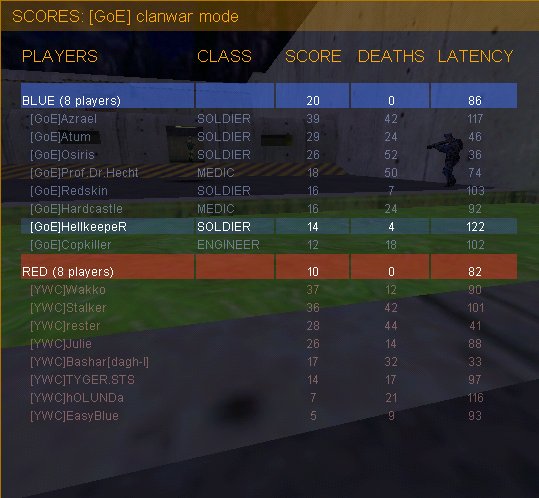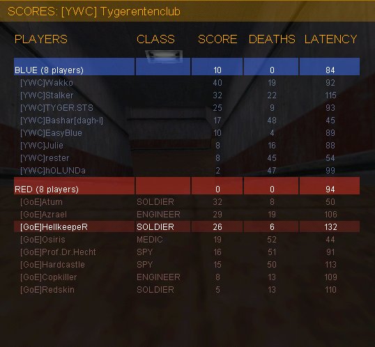 Wir fingen mit Well auf unserem Server an. Gleich zu Beginn droppte Hardcastle wegen eines Problems mit seinem Rechner. YWC idlete sofort, was aber natürlich nichts daran änderte, dass sie die Flag aus dem Flagroom warfen... Mein Flagreturntimer zählte runter, bei mir Stand "Flag retourned" und ich dachte, der Scout der sie klauen wollte, läuft nun ohne Flag heim. Also fuhr ich gemütlich den Lift hoch und guckte in den FR, ob die SG steht...tjo, die stand auch, aber da war keine Flag, denn der Scout hatte sie doch noch erwischt... Bumms, erster Cap. nach ca. 15min kam dann Hardcastle endlich wieder und schleppte auch gleich die Flagge der Gegner nen ganzes Stück raus, so dass wir cappen konnten. Ich stellte mich seelisch schon auf die Entscheidung in SD2 ein, als es uns gelang, 50s vor Schluss nochmal zu cappen, was von YWC mit massiver Attacke beantwortet wurde und wir mussten die Flagge mit 8 Mann am Tunnelausgang verteidigen bis zum Timelimit.