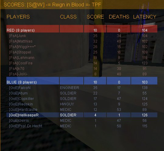 Wir fingen mit Well an. Schnell waren wir auf unseren Defense-Positionen aber schnell waren auch die ersten Medics am Tower. Die ersten Wellen konnten wir abwehren, nach ca 7-8 Minuten allerdings waren 4 Medics im Towerbereich, Atum und ich noch von vorigen Angriffen stark angeschlagen und bumms war der Lappen weg, 10:0 FsA. Dann plänkelte das Spiel vor sich hin, wir konnten erstmal jeden weiteren Flagtouch von FsA vermeiden, unsere Off hatte diverse der Art. Als dann einmal das rote Tuch schon auf der Brücke des FsA-Flagrooms lag, meinte mein Router ein wenig Zünglein an der Waage spielen zu müssen und ich machte meinen ersten Drop in irgendeinem Spiel von uns. Bei FsA wurde sofort geidlet, ich bin auf ISDN umgestiegen und es konnte weitergehen. Leider ist die Flag retourned in der Zwischenzeit und wir zitterten weiter bis 20s vor Schluss endlich gecappt wurde, 10:10.