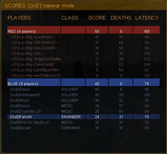 Nachdem erst mal Ungewissheit herrschte, gegen wen wir da eigentlich antreten (10.10.2000 20:30 friendly Style (irgendnen neuer clan, mit alten bekannten, ich peils nicht ;), maps 2fort, sd2- Hellkeeper) war nach einem Blick auf die HP des Gegners alles klar. Mal wieder ein Allstars Team ;) welches seine Member aus Bugs, CU, No-Clan, D-Walk, DO und k-attack rekrutiert. Tjo; klar also, dass es alles andere als leicht werden würde.