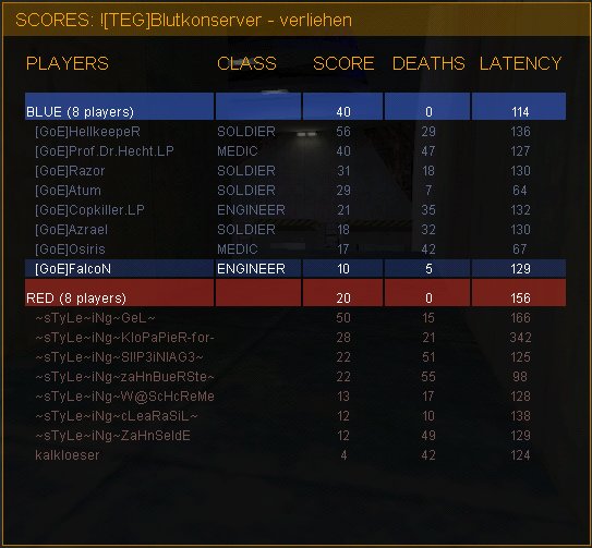 Anfangs sah es da auch recht gut aus für uns. Wir gingen in Führung bis diese komische Truppe auf die Idee kam, mal wieder den Lift als ausgang zu benutzen. Sehr verwirrend ;) Immerhin genug, um gleich eine Capreihe draus werden zu lassen und sTyLe ging mit 5 Caps aus der ersten Halbzeit.