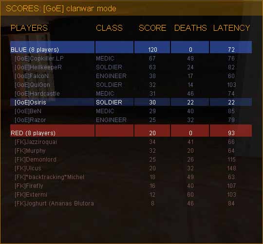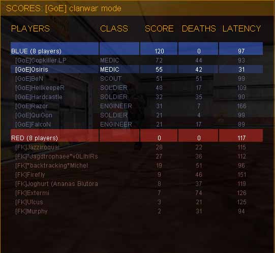 Also 2fort: Bei den letzten fights war auf 2fort ja irgendwie der wurm drin, die offense strampelte immer wild in der gegnerischen base herum aber viel kam dabei nicht heraus. Gegen FK platzte der knoten und wir konnten mit gut koordinierten angriffen ganze 12 mal die rote Flag mitgehen lassen. Hat fasst keiner gemerkt :) Die def schrie sich wieder so an, das hell sein bc zumachte und wie bei den letzten paar fights lieber tippte ;) 2mal gelang es dem freundeskreis zu cappen. Also 120:20 für uns, wenn man die neue def taktik berücksichtigt ganz ok.