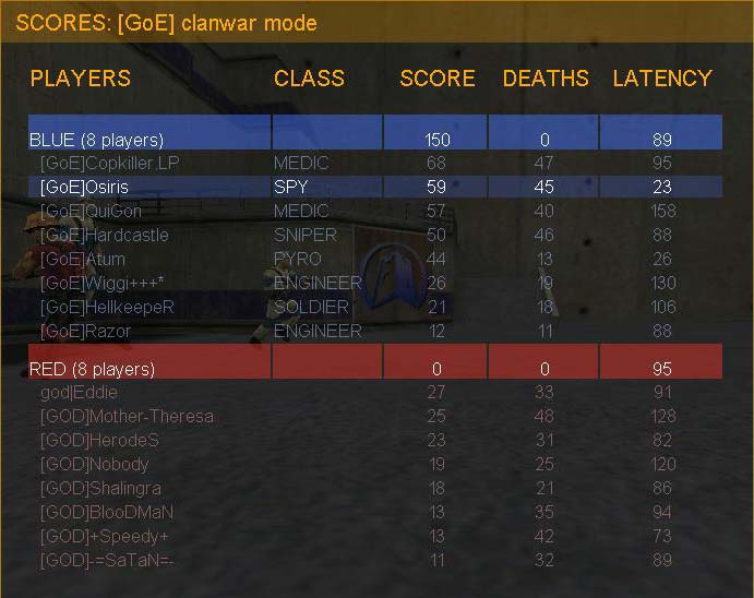 In Well ging GOD wesentlich routinierter an den Start, und es war eine sehr viel ausgeglichenere Halbzeit, in der uns gegen eine wechselnde GOD-Defense mit zwischenzeitlichem HW auf dem Tower dann doch 6 Caps gelangen. GOD verbuchten evtl durch ihre Verwirrtaktik bedingt (6 Spieler auf dem Server, dann 7, dann 9, dann schließlich 8 :) ) 2 Caps gegen uns.
