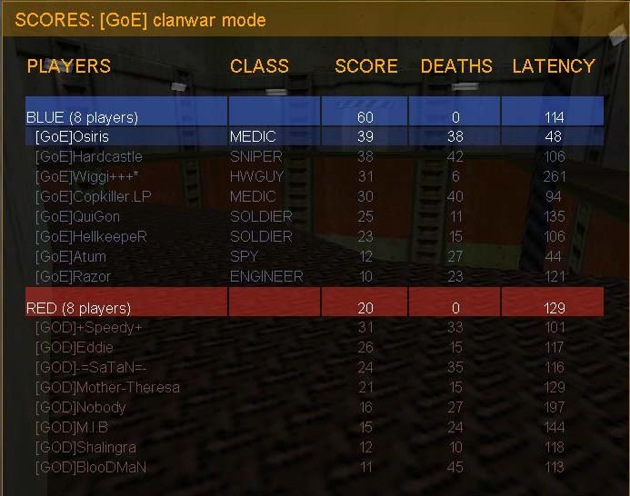 Unser System der Mediclastigen Offense, gegen Ende auch mit originelleren Classes, ging allerdings voll auf, bis auf einen Flagreturn vor GODs unterem Resup konnten wir den Lappen bei jedem Touch auch heimtragen.
