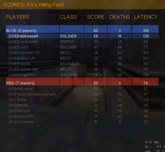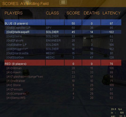 Los gings in SD2, wo mir seit langem mal wieder ein Demoman in der gegnerischen Off begegnete, der mir auch anfangs etwas Kopfzerbrechen bereitete, weil ich einfach ungeübt im Umgang mit dem Kerl war ;) Naja, diese Probleme wurden dann schnellstens beseitigt, wir cappten 3 mal, bis *bumms, danke Chello* nur noch 5 AV-ler auf dem Server waren. Also Idle-Alarm bis die Jungs zurückkamen und dann schafften wir noch 2 Caps. Durch kurzzeitiges Chaos in der Def schafften sie es dann auch noch, die Flagge auf das Brett zu tragen, dort verweilte sie dann aber eine Minute bis sie sich entschied, an ihren angestammten Platz zurückzukehren, Endstand 50:0.