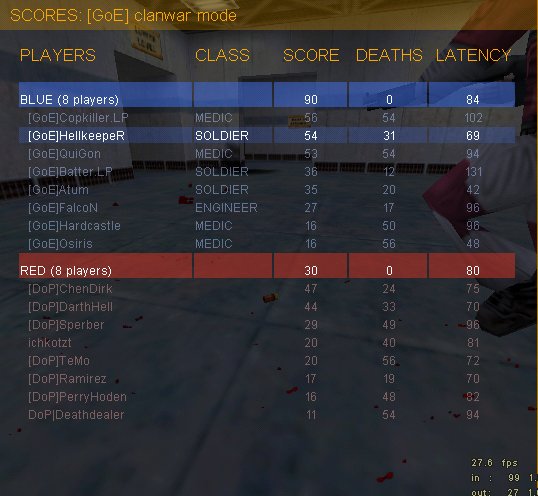 So langsam schoss ich mich ein, aber DoP griff immer wieder höchst koordiniert und effektiv an, so dass von 3en doch immer wieder 1-2 durchkamen, allerdings eine ganze Weile lang uneffektiv bis dann plötzlich doch noch 2 Caps zustande kamen, wir wurden wohl unkonzentriert, ein 4. hätte nur 10s mehr Zeit gebraucht *puh*. Naja, unsere Off war von Anfang bis Ende konzentriert und schleppte den roten Lappen 10 mal zu uns.