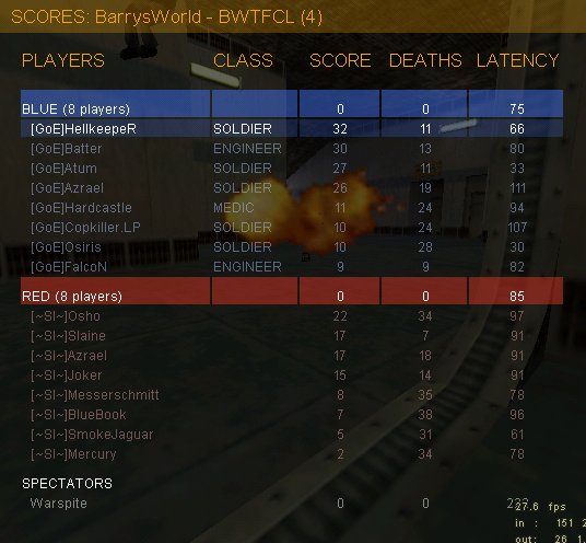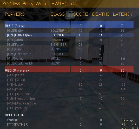2fort kannten wir ja SI noch, letztes mal 20:20. Naja, es ging los, plätscherte vor sich hin, alle Medics liessen mich im wahrsten Sinne des Wortes links liegen und rannten zum Lift. Ich fing dann an, selber etwas nach links zu gehen, um Spass zu haben. Irgendwann dann der Gau: Batter killt Medic, und sich, Atum den nächsten, sich und unseren Engi und der 3. Medic die SG. Also lag unser Lappen wieder nicht wo er hingehörte, aber er kam auch nicht weiter, da irgendjmd was gegen nen Gegencap hatte. :) Und dann plätscherten die Medics wieder auf uns ein, unsere auf die SI und nichts passierte. Ja, und dann war die Map zu Ende. 0:0 D'oh