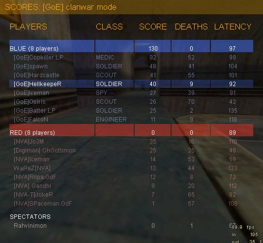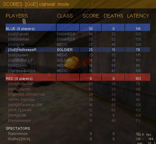 PC Probleme, schlechte Verbindungen und teilweise fehlenden Spielern auf beiden Seiten liessen das Spiel unter keinem guten Licht im prematch stehen. Dennoch konnte schliesslich mit leichter Verspätung losgelegt werden. Der gewöhnliche flag rush brachte uns trotz telefrags an den nme key, den wir nach und nach immer weiter richtung gc befördern konnten. Daran versuchten uns ein engi und 3 soldier zu hindern. Dennoch gelang nach ein paar minuten und beherzten sprüngen quer übers minenfeld (yard) der erste cap. Da auch in der defense der key einmal wanderte, entschieden wir uns noch einmal zu cappen. Allerdings hatte nva etwas dagegen, noch mal in eau de rock2 eingenebelt zu werden. So gelang es ihnen durch eine sentry gun bei der gas chamber und 2 dort sesshafte soldier uns zu stoppen.