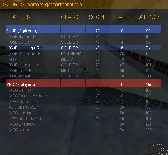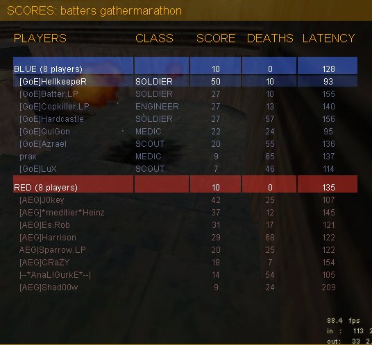 Los gings auf 2fort und vom ersten Conc an spielte AEG, als ob es die Spirale gar nicht gab. :) Oder eher, als ob man den Spiraleingang irgendwie nur zu bestimmten Zeitpunkten passieren konnte... Naja, Batter hatte viel zu tun, ich selbst wenig und das, was bei Batter dann doch mal durchgefloodet wurde, fing entweder QuiGon oder Cops Sentry ab. Unsere Offense tat sich zwar anfangs auch etwas schwer, in den letzten 15min konnten sie aber vernünftig Druck machen, was zu zwei Caps führte.